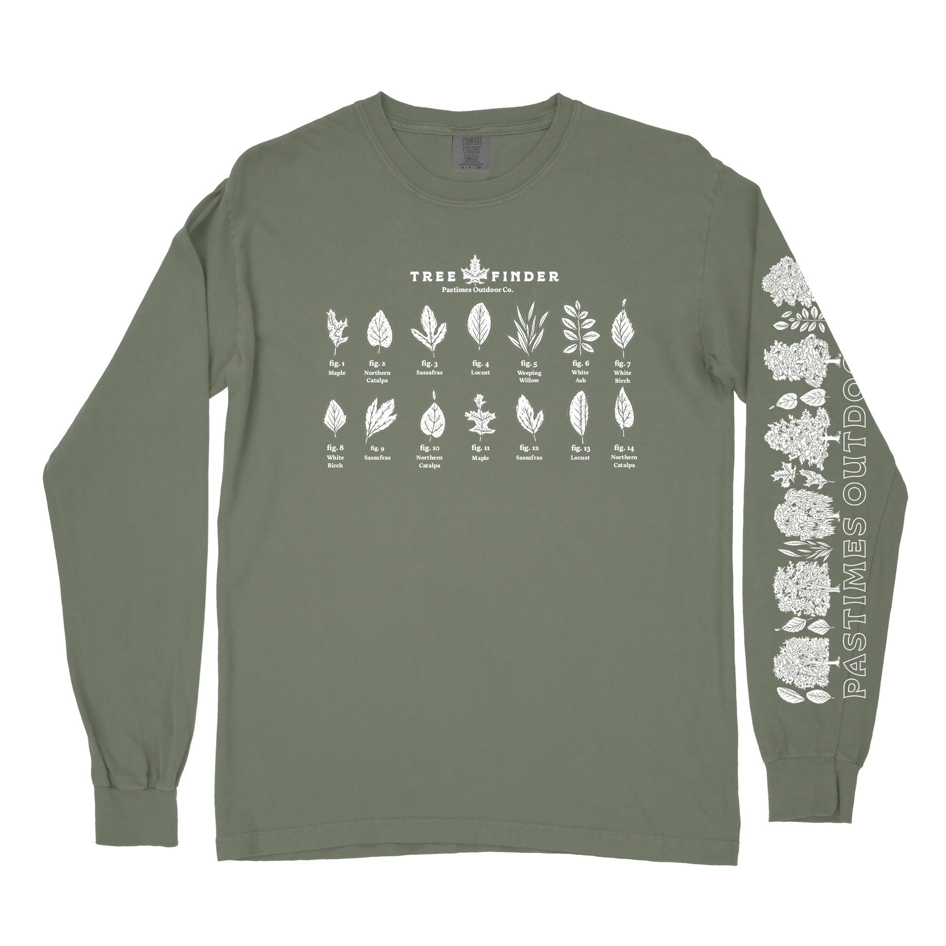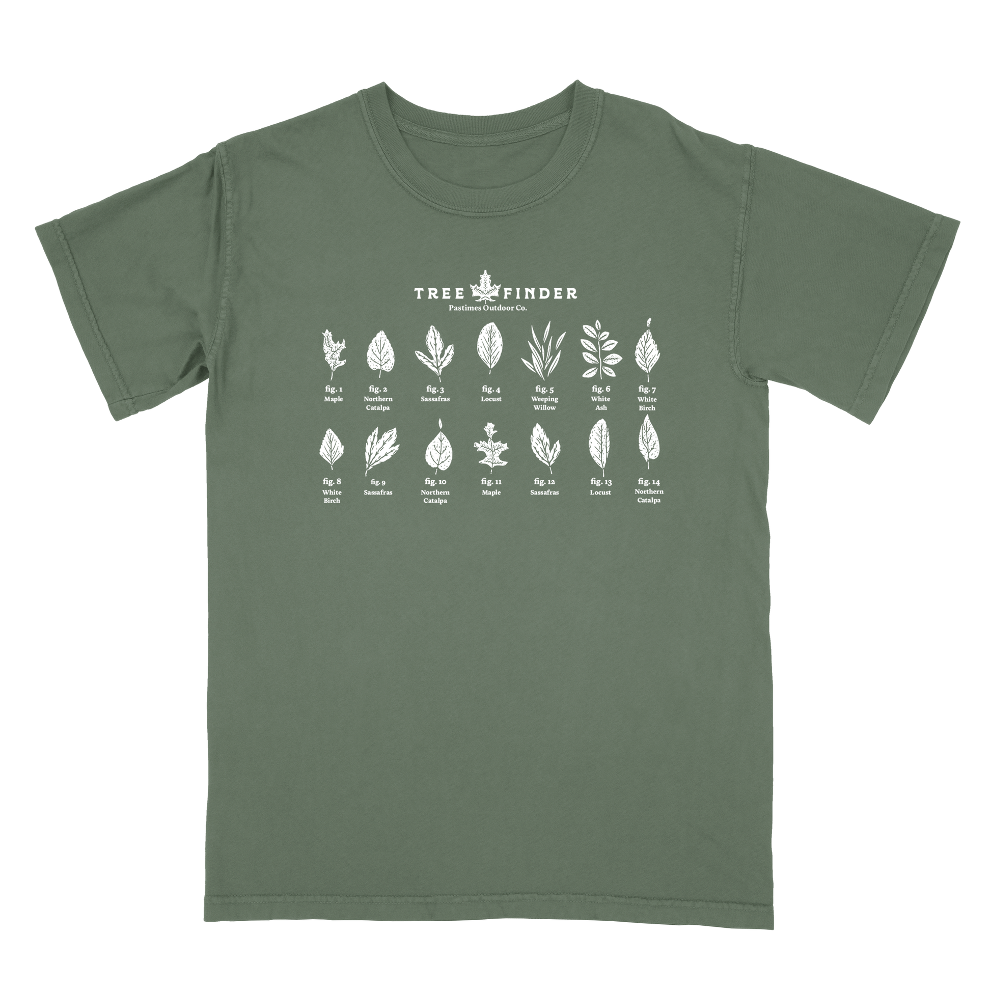 Labelled tree illustrations on back and the corresponding leaves on the front. Printed with white water based inks for that smooth finish on a moss high quality 100% ring spun cotton Comfort Colors tee.