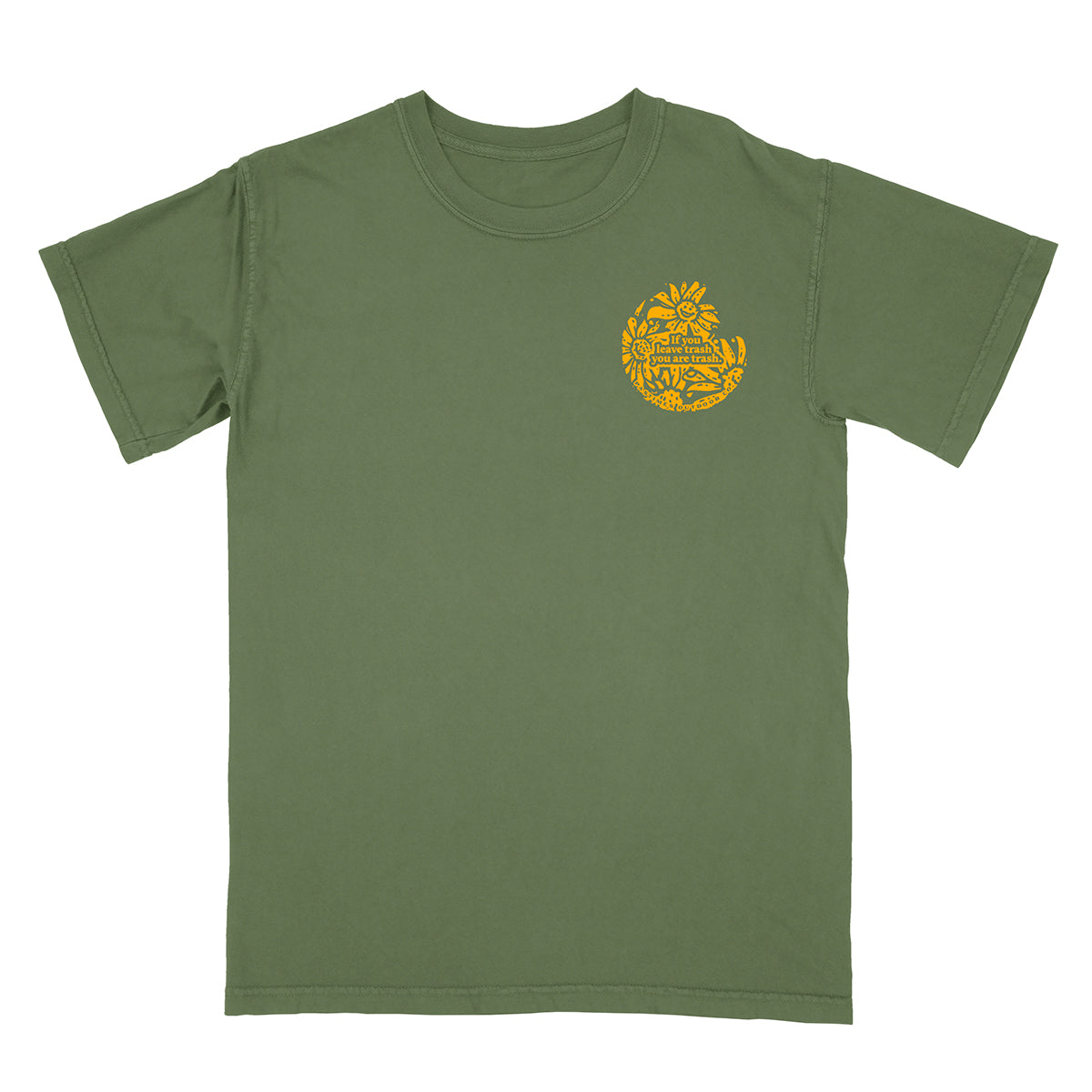 "If you leave trash, you are trash" printed with yellow-orange water-based inks on 100% cotton Comfort Colors tee.