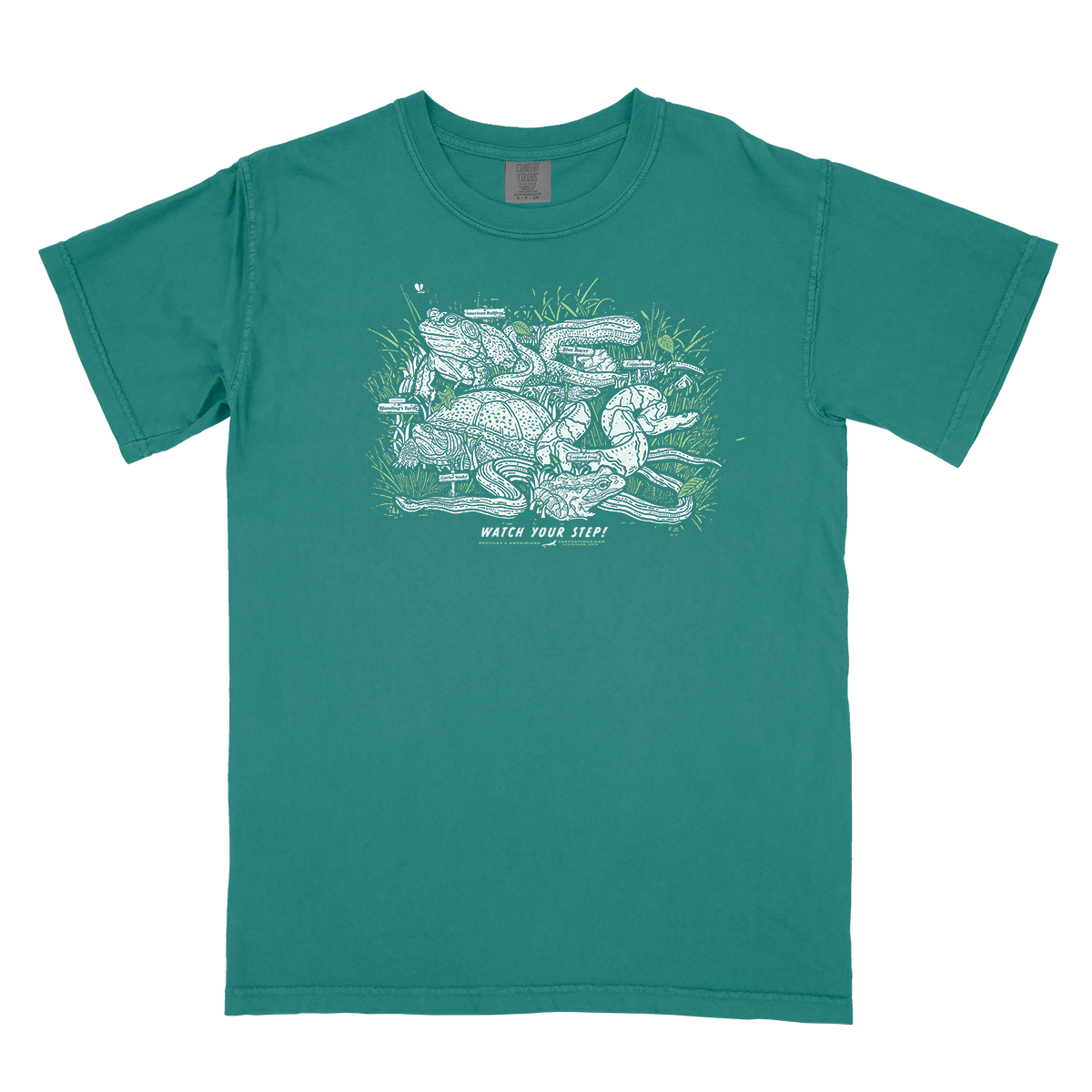 “Watch Your Step” printed with water-based inks on 100% cotton Comfort Colors tee.