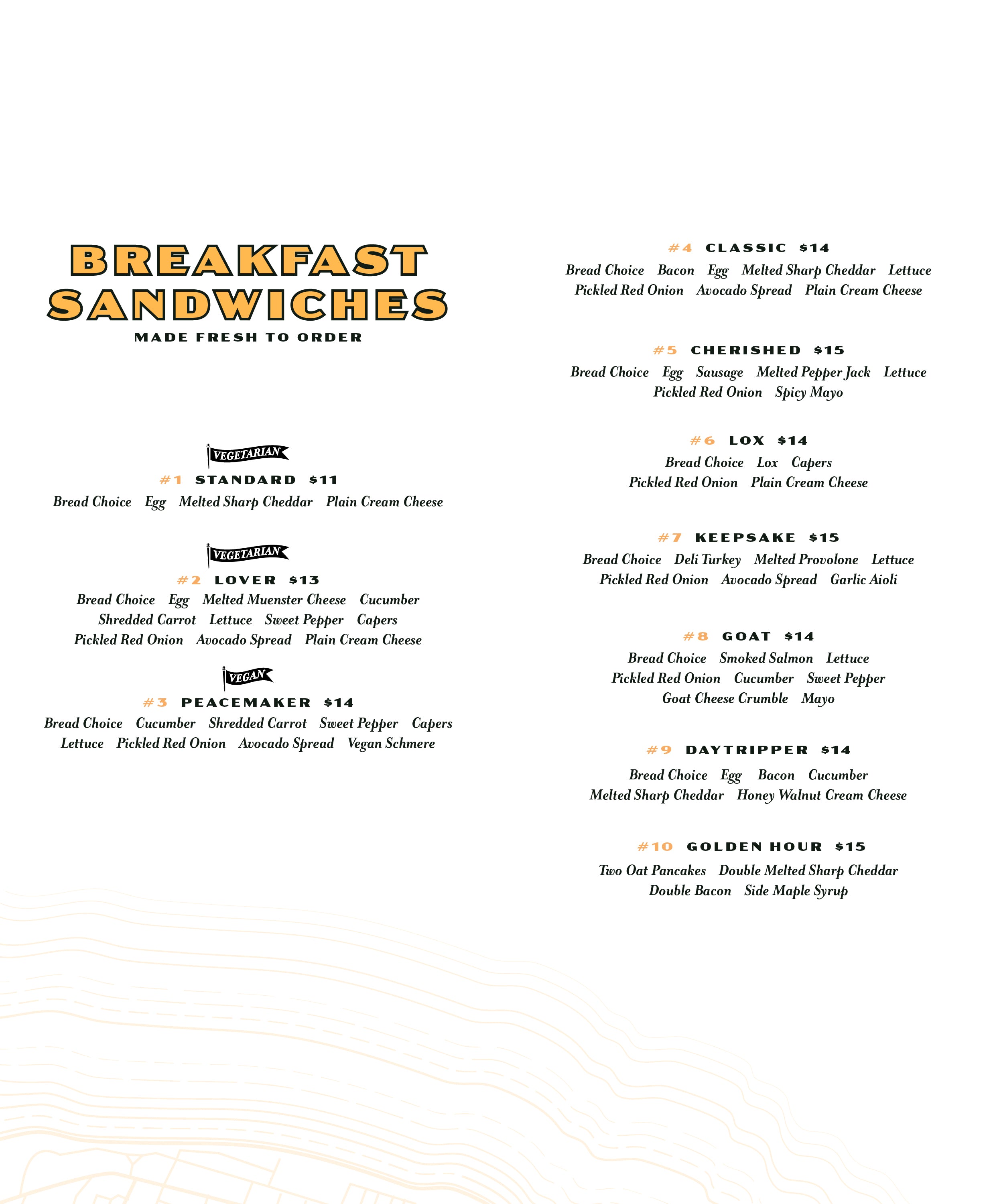 We have a rotating menu that has items and ingredients come and go often. We have many options that sell out each day so it is always best to have a backup—and come early!*We are currently only taking orders at the counter.