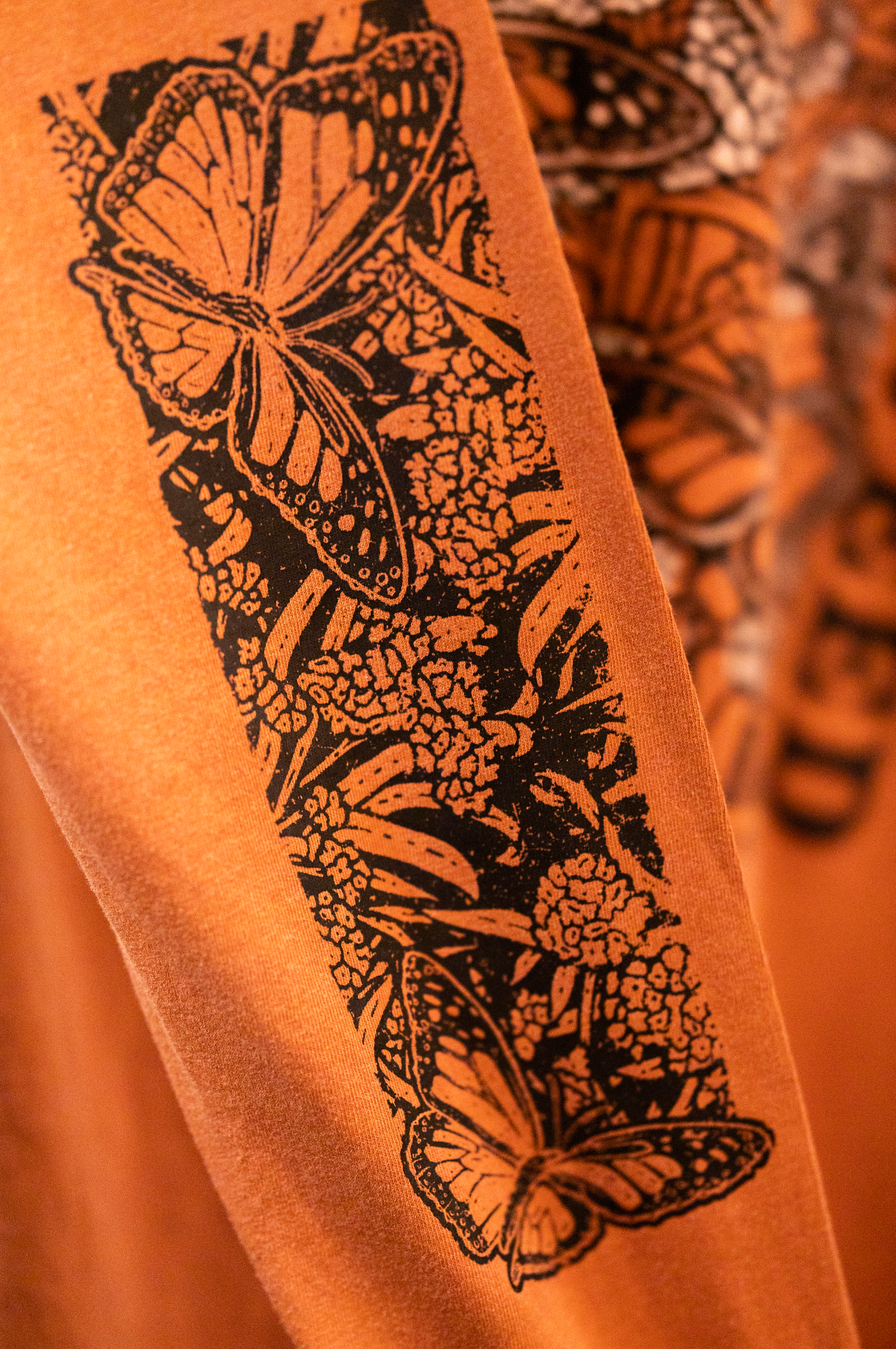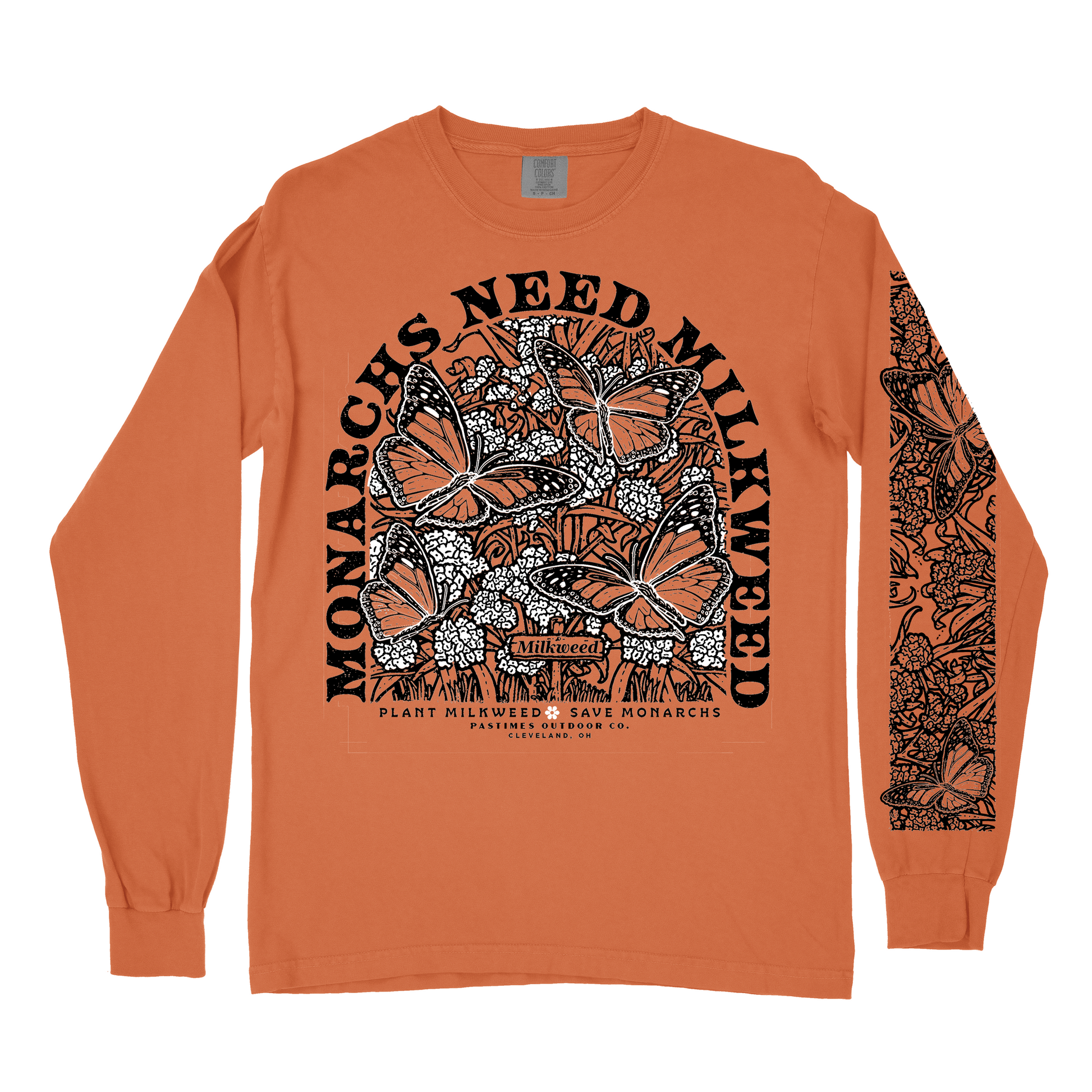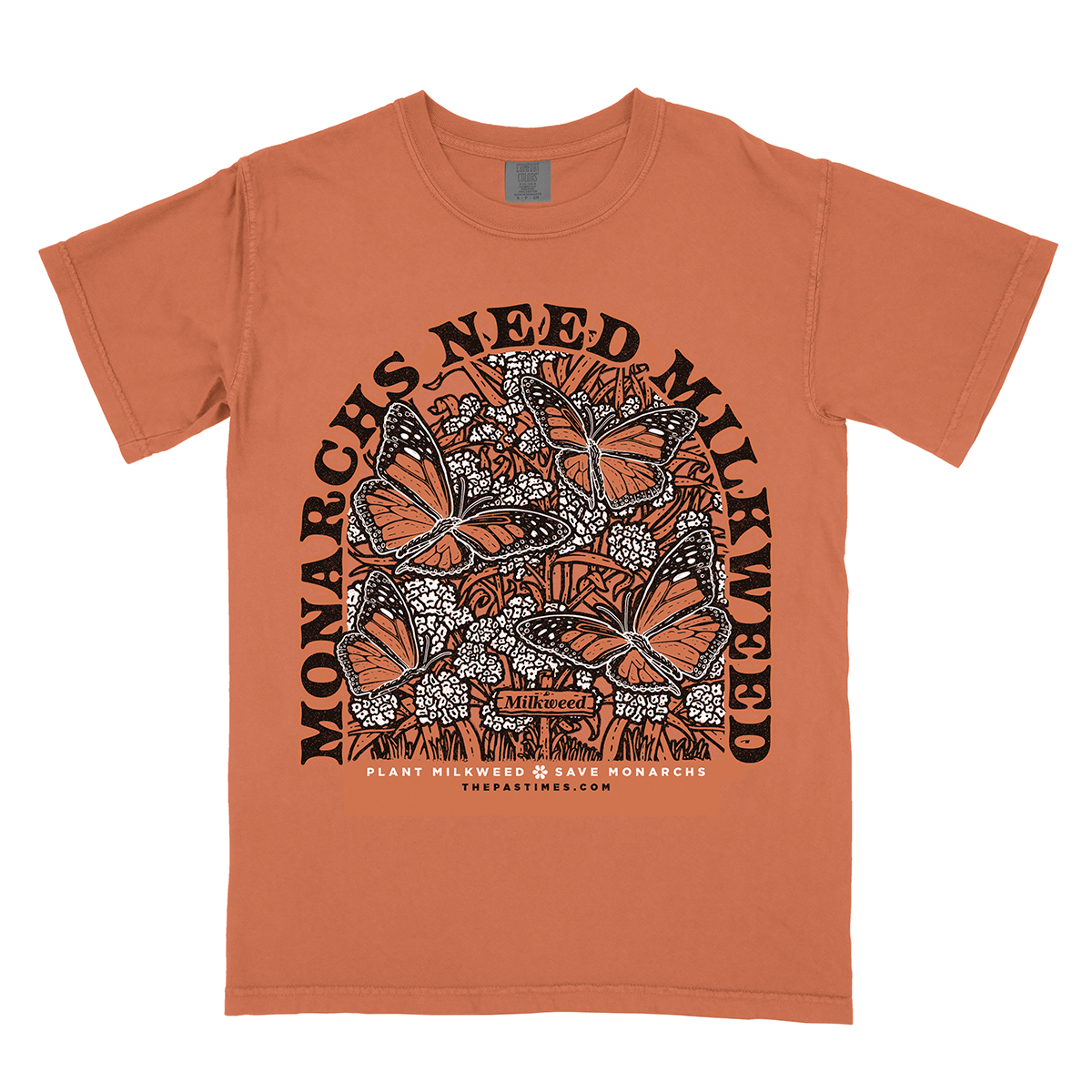 “Monarchs Need Milkweed” printed with water-based inks on 100% cotton Comfort Colors tee.