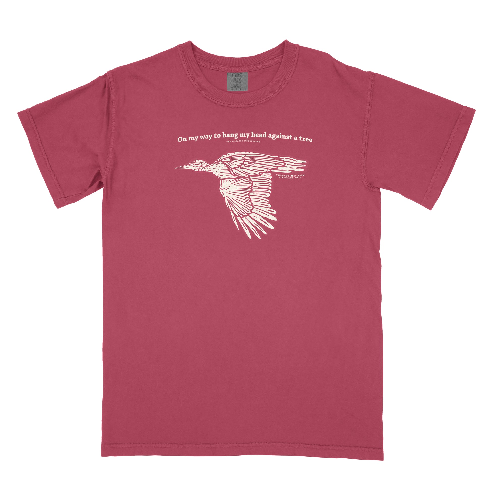 “On My Way to Bang My Head Against a Tree" woodpecker printed with water-based inks on 100% cotton Comfort Colors tee.