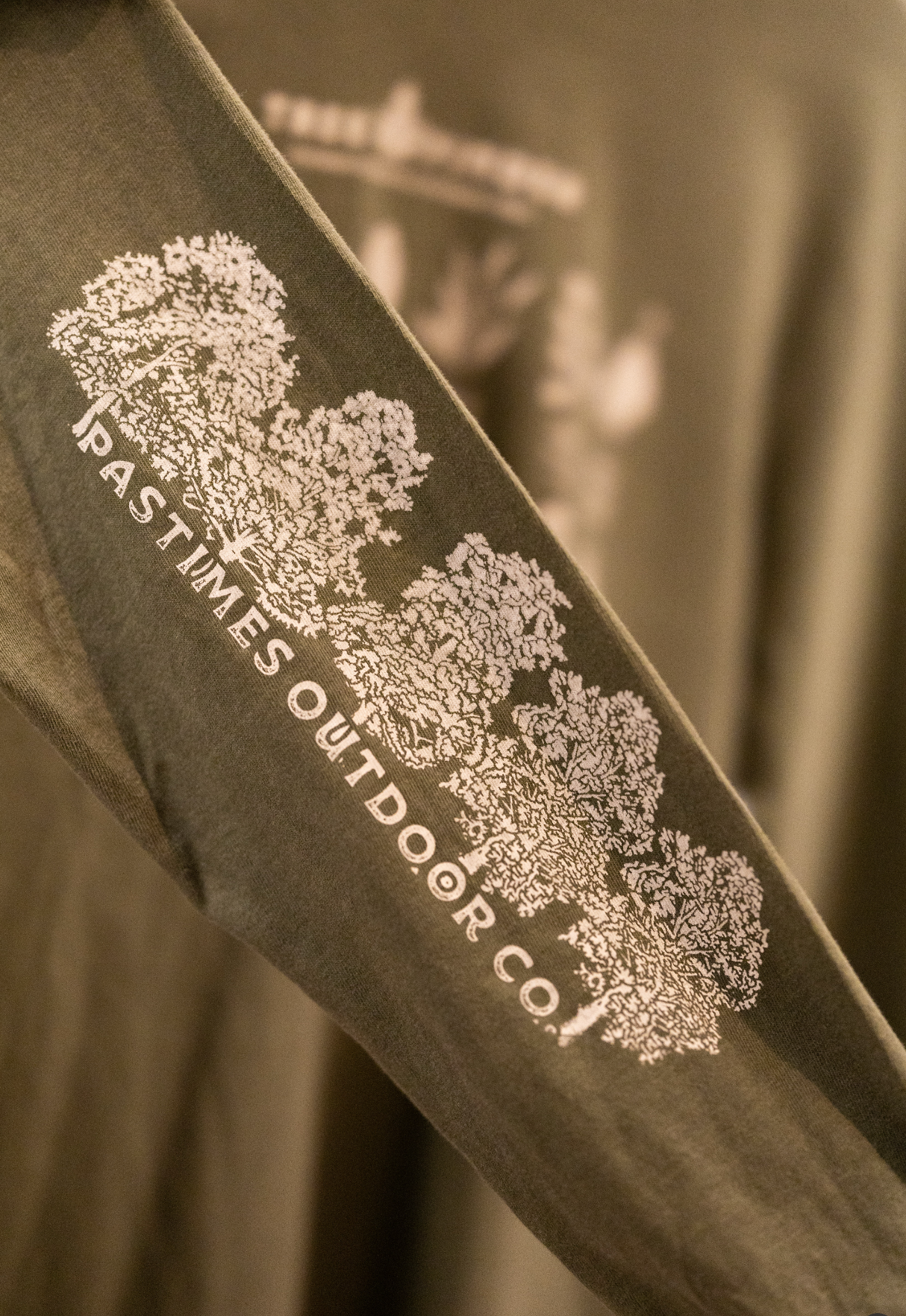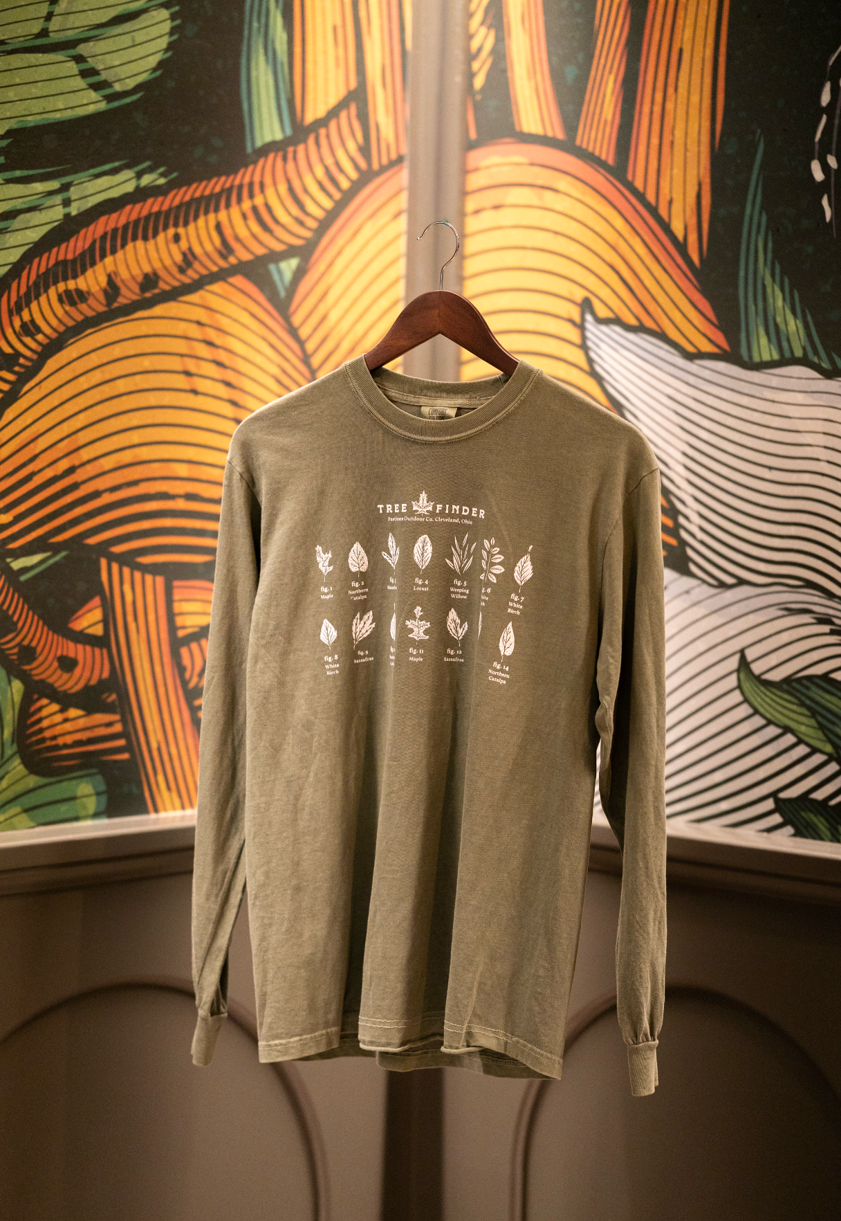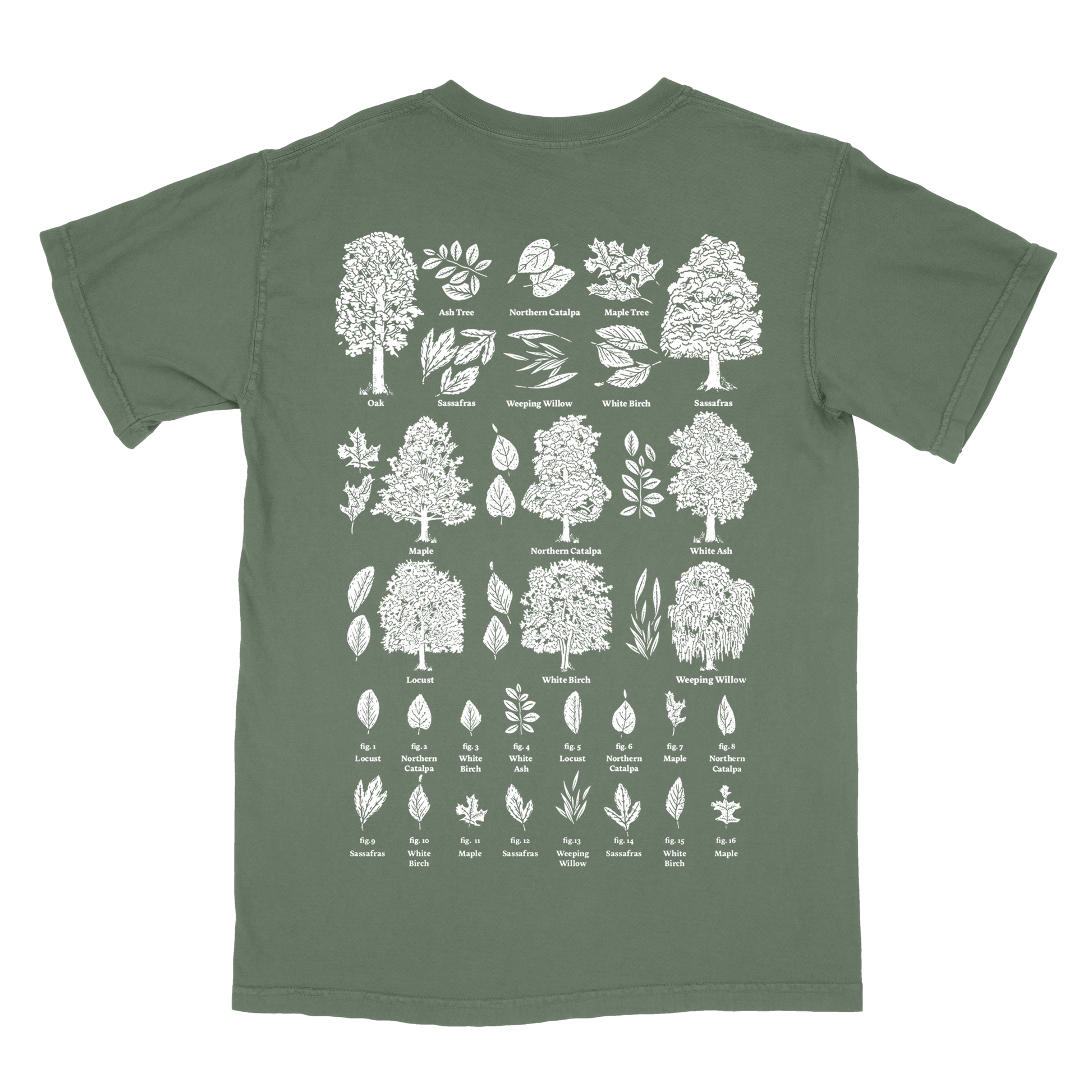 Labelled tree illustrations on back and the corresponding leaves on the front. Printed with white water based inks for that smooth finish on a moss high quality 100% ring spun cotton Comfort Colors tee.