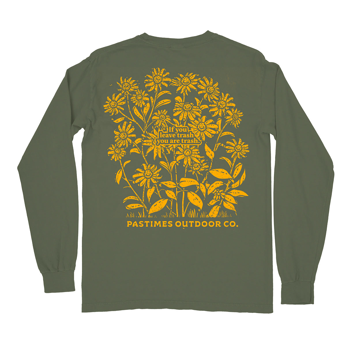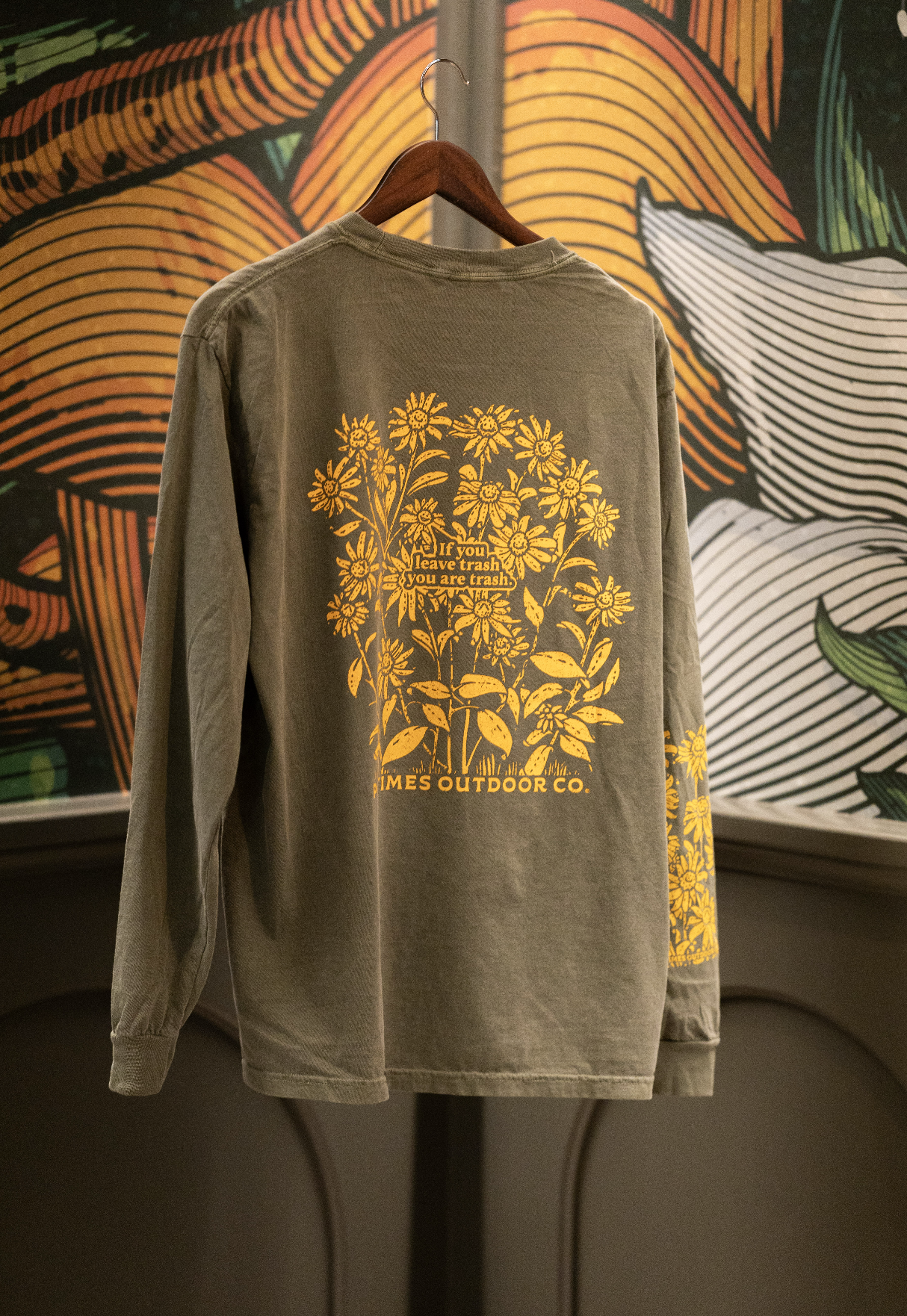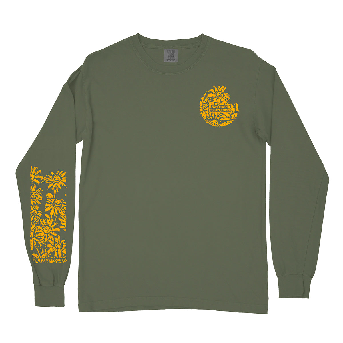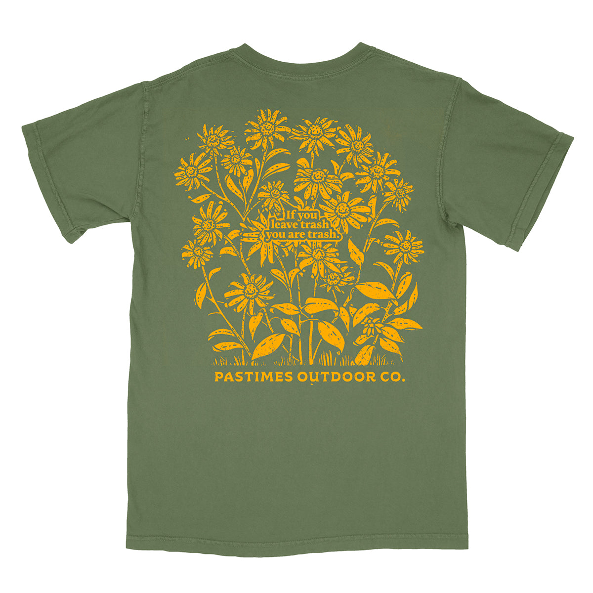 "If you leave trash, you are trash" printed with yellow-orange water-based inks on 100% cotton Comfort Colors tee.
